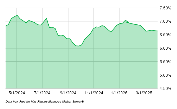 According to Freddie Mac, 30-year mortgage rates are 6.64% and 15-year rates are 5.82% as of April 3, 2025. The following chart shows the 30-year mortgage rate trend over the last year.