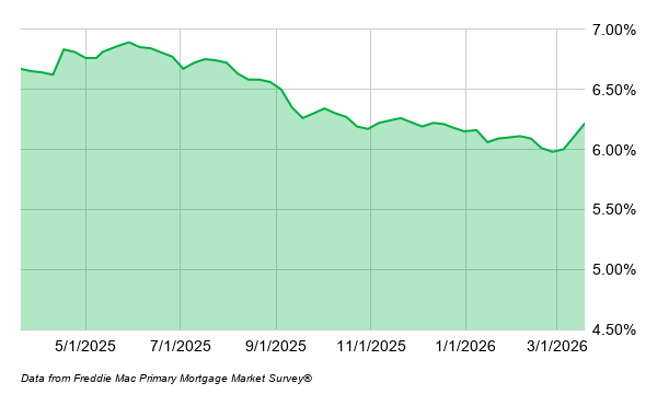 According to Freddie Mac, 30-year mortgage rates are 6.22% and 15-year rates are 5.54% as of March 19, 2026. The following chart shows the 30-year mortgage rate trend over the last year.